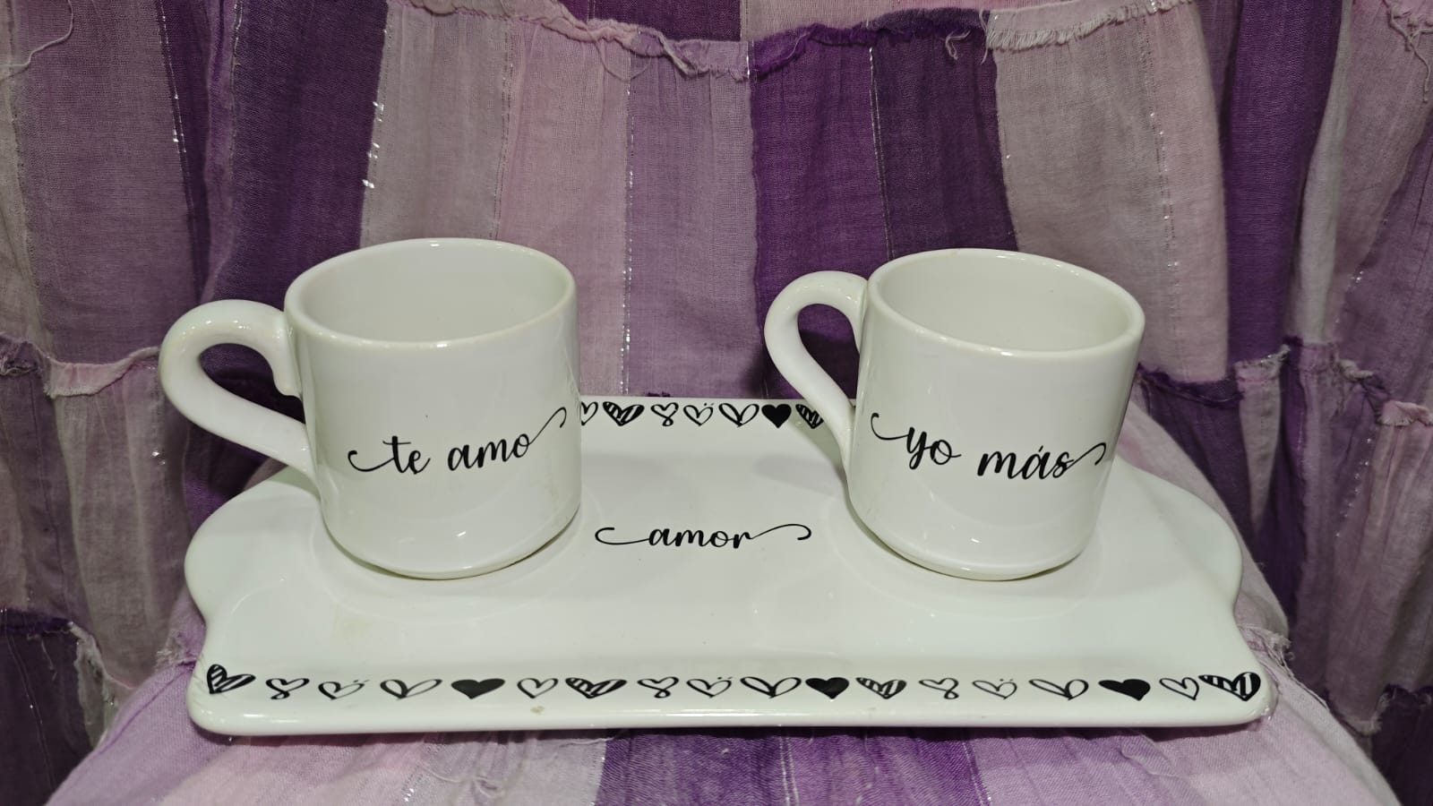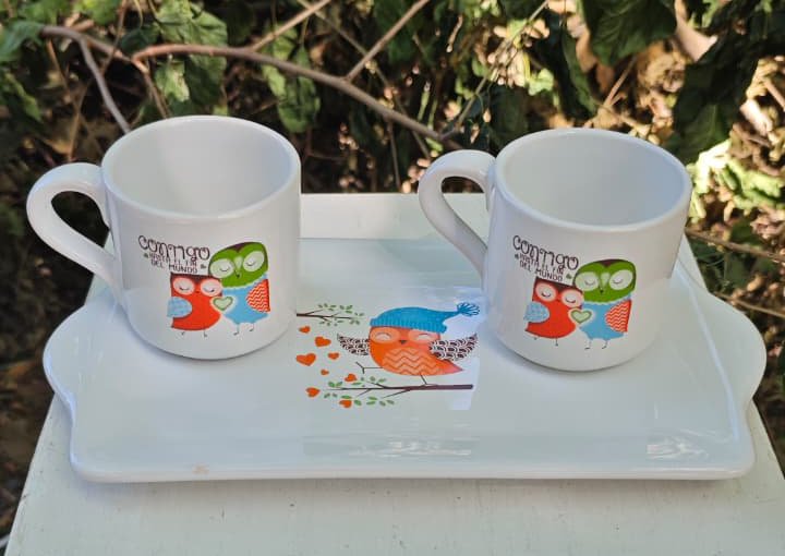 Set exclusivo para amantes del café. Incluye una bandeja servidora y dos pocillos de café de 150 cc con terminación decorada. Piezas: Bandeja + 2 Pocillos.