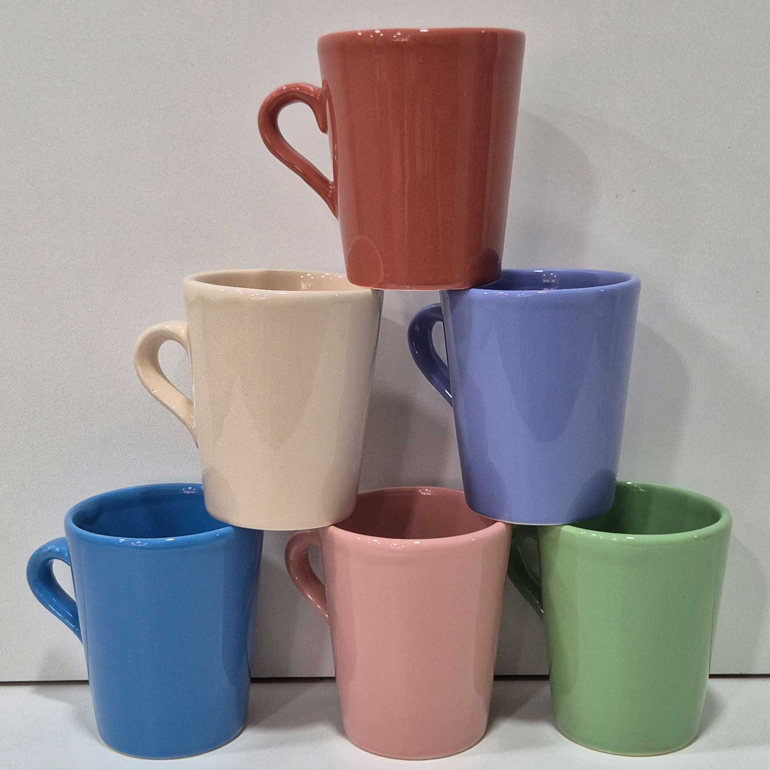 Jarro esmaltado brillante en seis colores surtidos. Moderno y funcional. Apto para microondas y lavavajillas. Especificaciones: 215 cc - 95 x 81 mm.