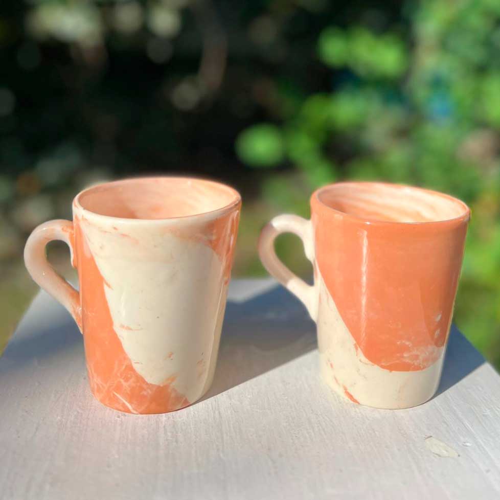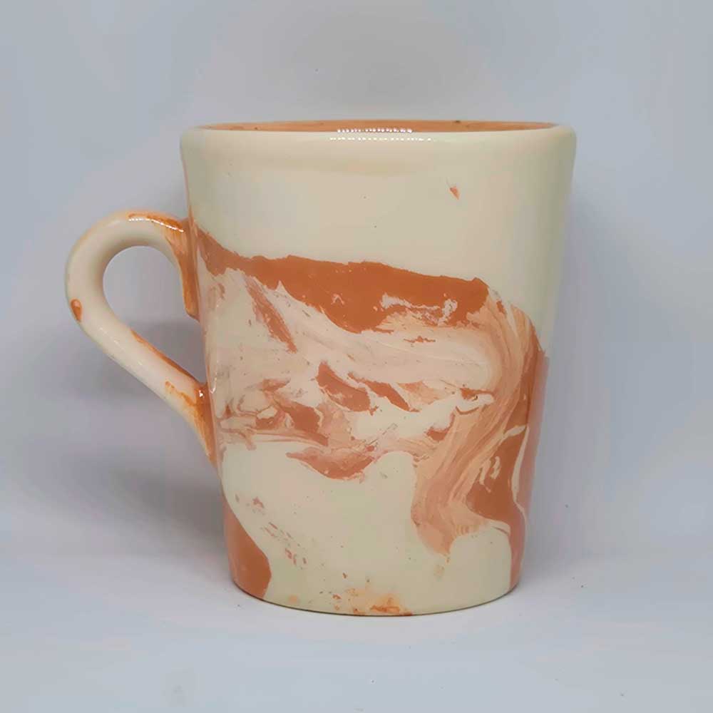 Jarro marmolado con vetas únicas y acabado brillante. Diseño artesanal, apto para microondas y lavavajillas. Especificaciones: 215 cc - 95 x 81 mm.