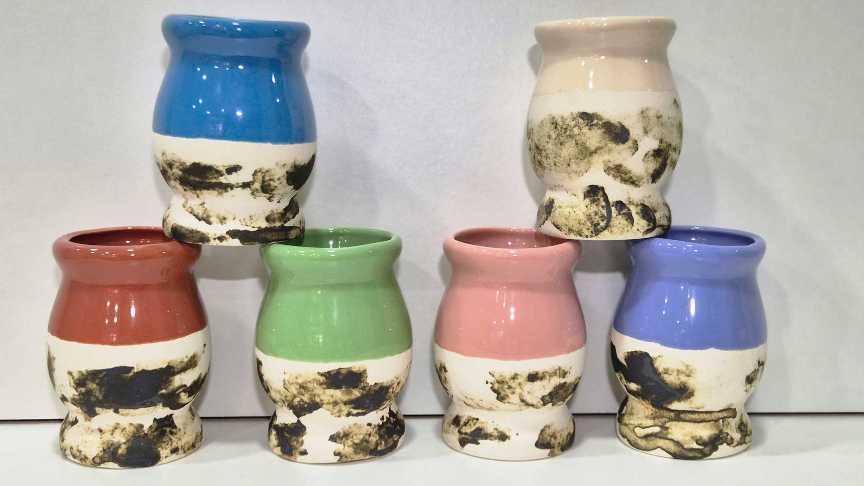 Mate artesanal texturado, decorado a mano en seis colores surtidos: coral, crema, rosa, verde, azul y lila. Aporta calidez. Apto para microondas y lavavajillas. Especificaciones: 10.3 cm  x 7.3 cm.